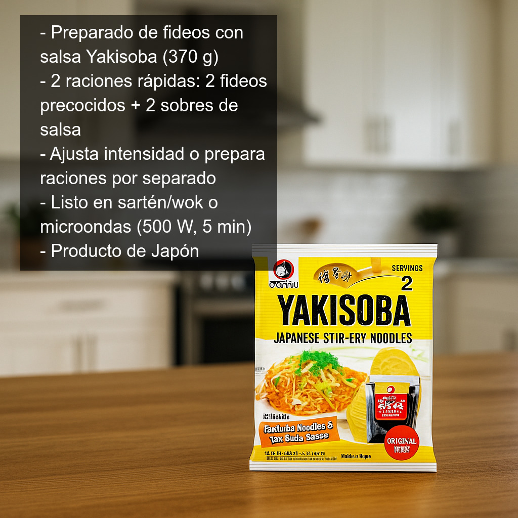 Disfruta en casa del sabor más popular de la cocina callejera japonesa con este preparado de fideos con salsa Yakisoba (370 g), ideal para elaborar 2 raciones de forma rápida y sencilla. El pack incluye dos bolsas de fideos precocidos y dos sobres de salsa yakisoba, para que puedas ajustar la intensidad del sabor o preparar las raciones por separado.