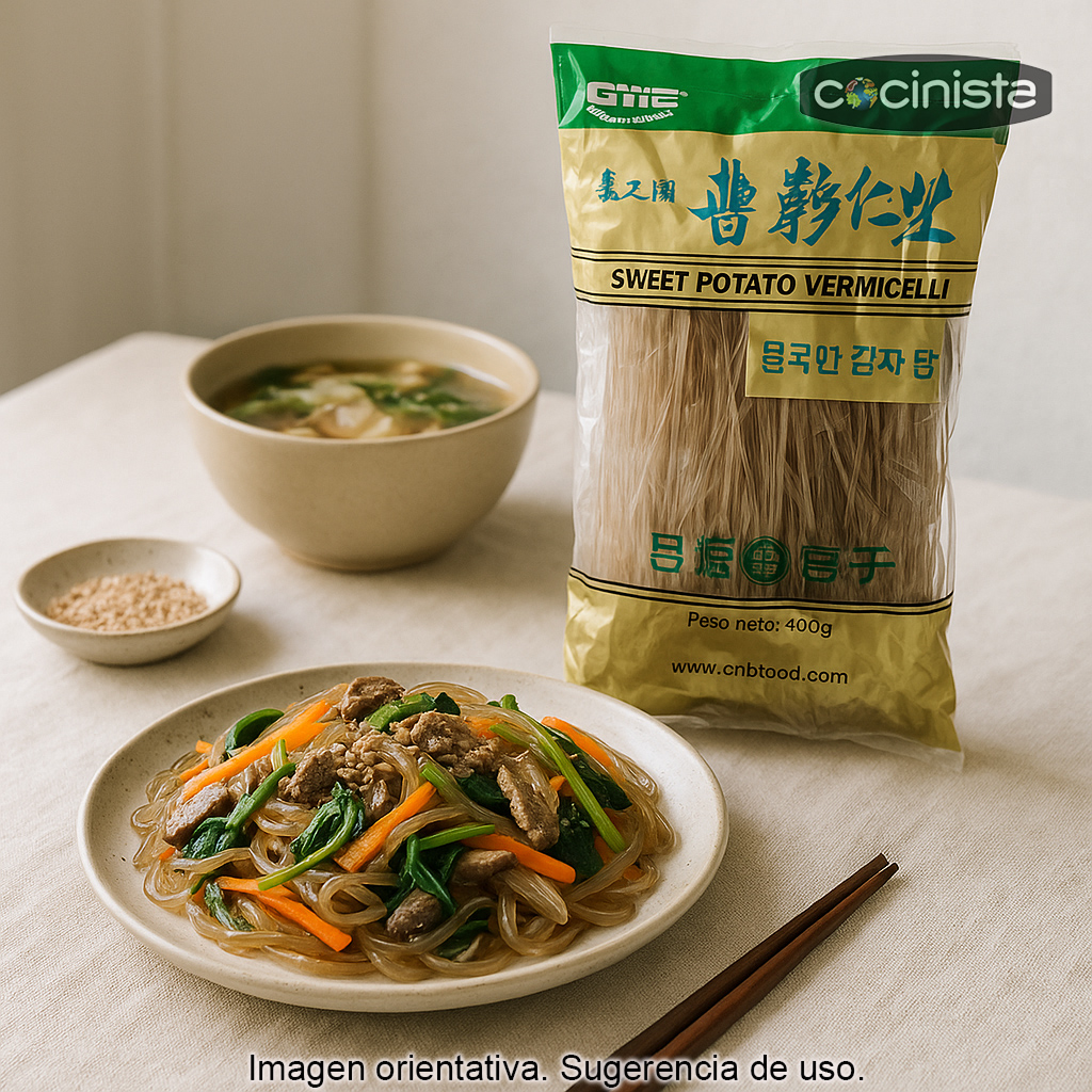 Son ideales para preparar recetas tradicionales como el Japchae coreano (salteado de verduras y carne o tofu), y también funcionan de maravilla en sopas, hot pot, guisos y salteados rápidos tipo wok. Al ser fideos de almidón, aportan una sensación ligera en boca y quedan especialmente bien con sabores intensos como soja, sésamo, ajo, jengibre o picantes.