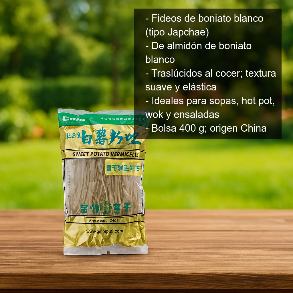 Los fideos de boniato blanco (también conocidos como fideos tipo Japchae o fideos de almidón) son un ingrediente imprescindible en la cocina asiática. Elaborados a base de almidón de boniato blanco, se caracterizan por su aspecto traslúcido una vez cocidos y por una textura suave, elástica y agradable, perfecta para absorber salsas y caldos sin perder consistencia.