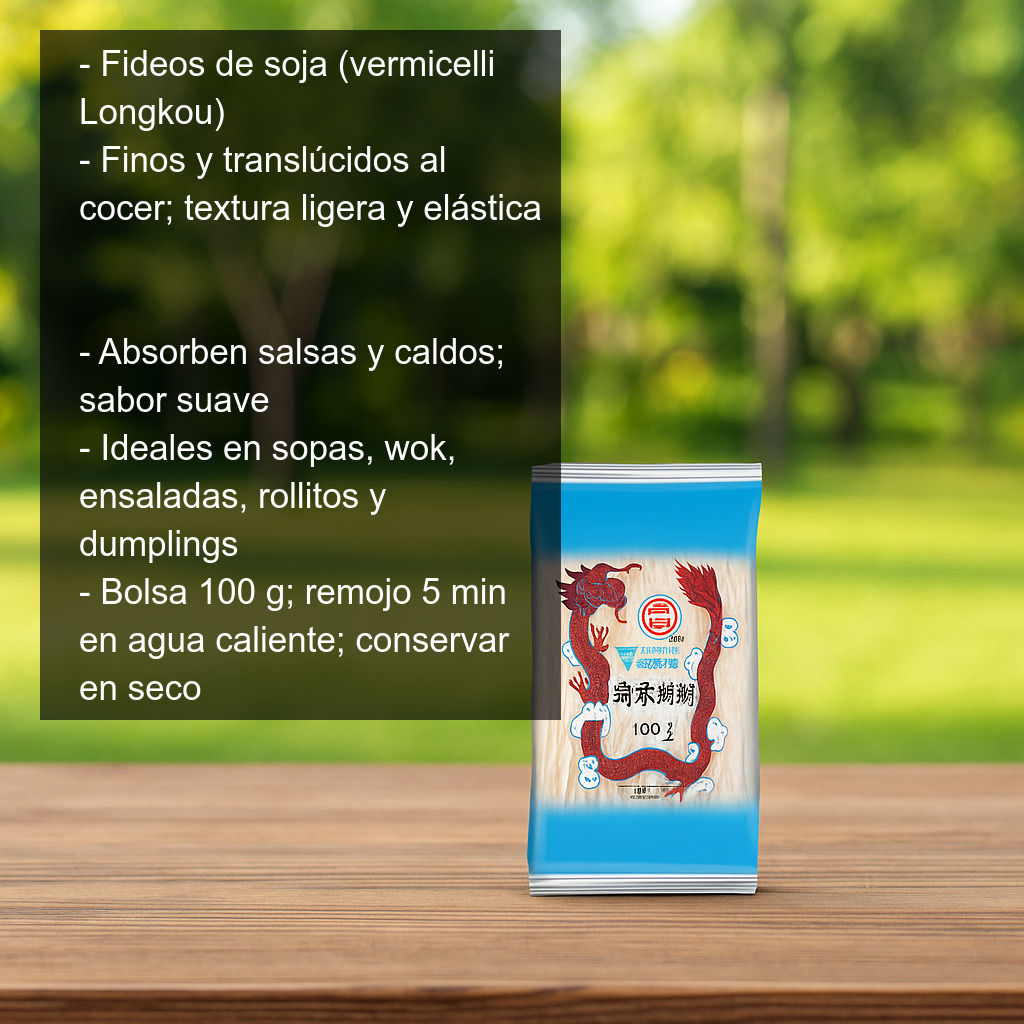 Los fideos de soja, también conocidos como fideos de cristal o vermicelli, son un ingrediente imprescindible de la cocina asiática. Estos fideos muy finos y translúcidos (una vez cocidos) se elaboran a partir de almidón y destacan por su textura ligera y elástica, perfecta para absorber salsas y caldos. Su nombre tradicional es Longkou y se utilizan tanto en sopas como en salteados en wok, ensaladas templadas y rellenos.