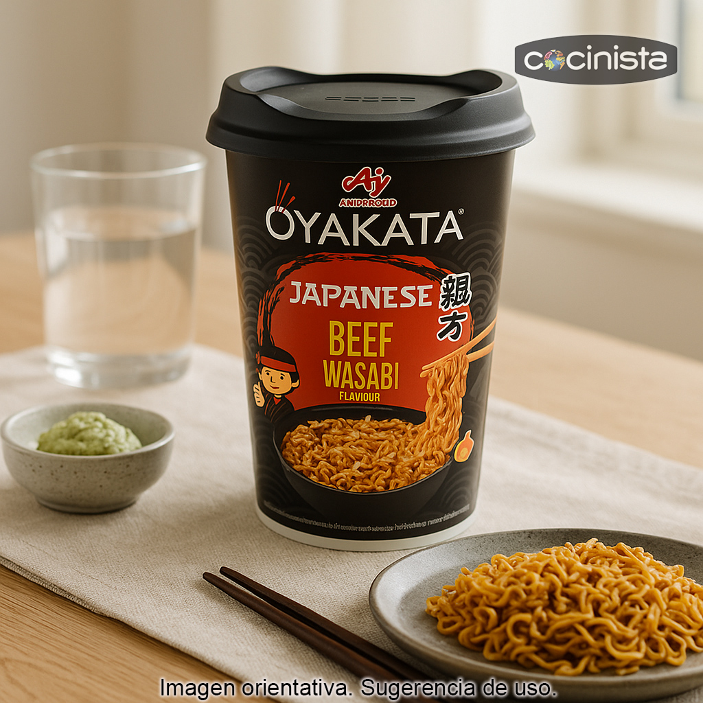 Este producto es de la marca Oyakata, una división de la prestigiosa firma japonesa Ajinomoto, reconocida por su experiencia en sabores asiáticos y condimentos. El vaso incorpora una tapa escurridora que permite preparar los fideos al estilo “seco”: se hidratan, se escurre el agua y se mezclan con su deliciosa salsa para conseguir una textura más intensa y un sabor más concentrado.