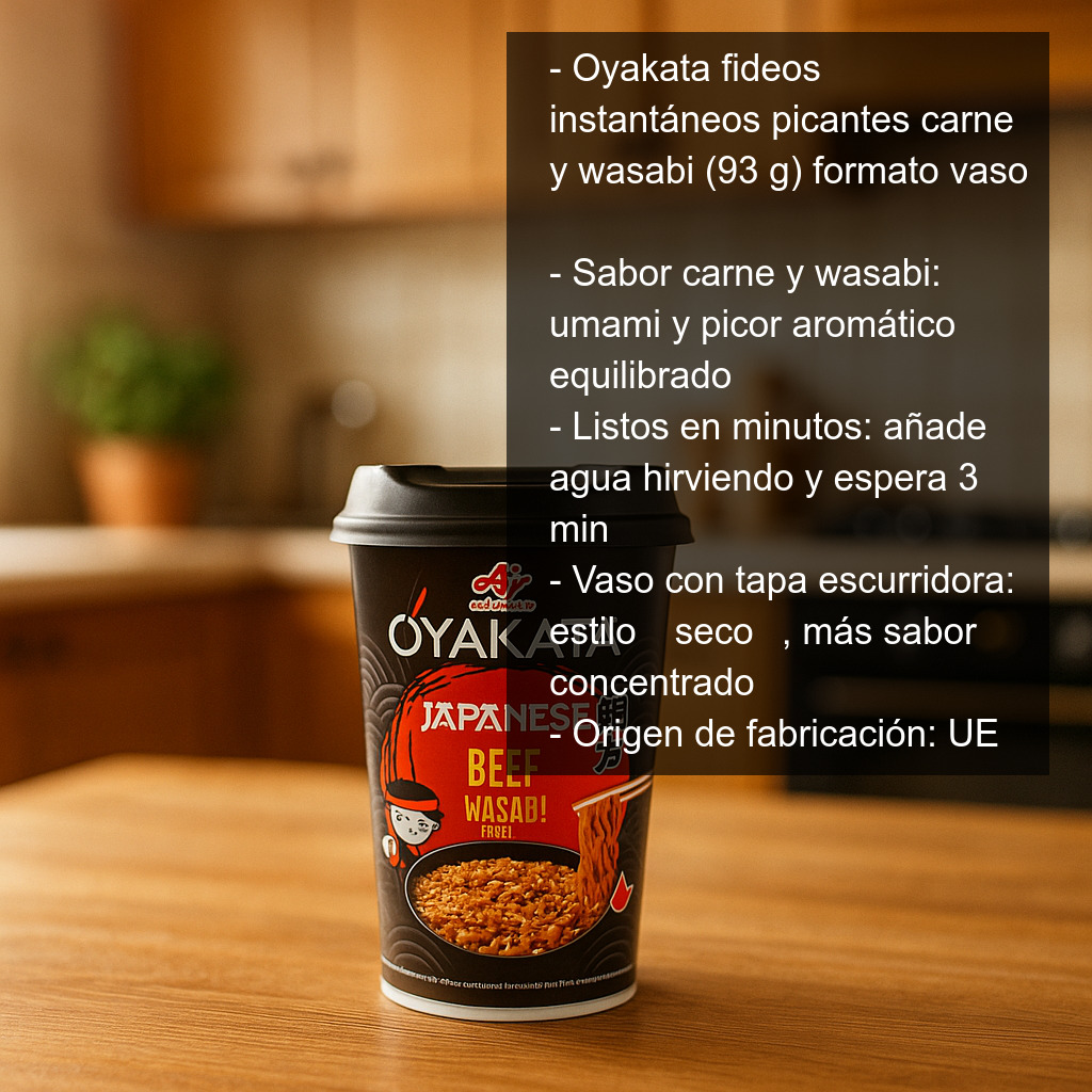 Fideos instantáneos picantes con sabor a carne y wasabi (93 g) en práctico formato vaso, ideales para quienes buscan un ramen/noodles instantáneo con un toque diferente: el umami de la carne y el punto aromático y ligeramente picante del wasabi. Se preparan en pocos minutos simplemente añadiendo agua hirviendo, perfectos para una comida rápida en casa, en la oficina o para llevar.