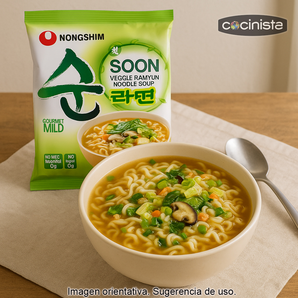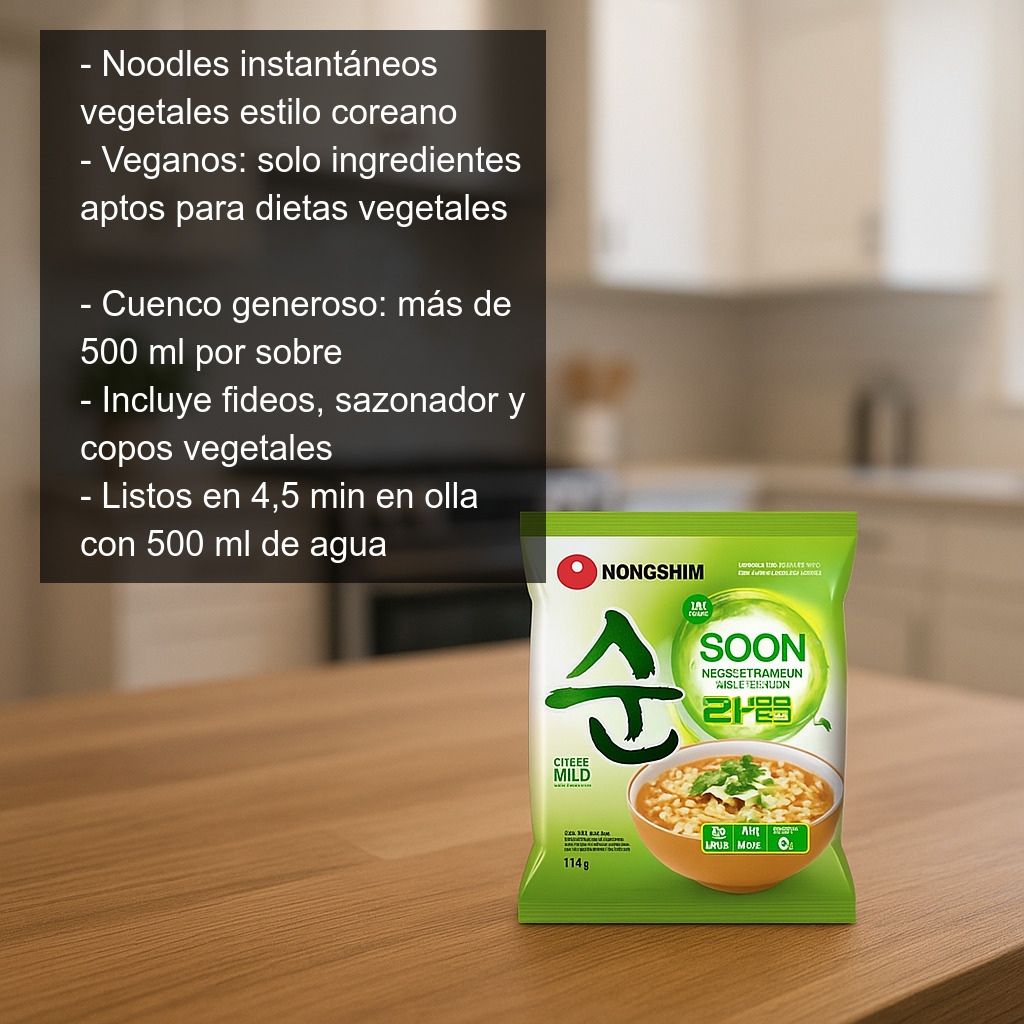 Disfruta en casa de un auténtico cuenco de fideos instantáneos vegetales al estilo coreano. Este paquete de noodles instantáneos veganos está elaborado exclusivamente con ingredientes aptos para dietas vegetales y te permite preparar, en pocos minutos, una sopa de fideos reconfortante y sabrosa. Con un solo sobre obtendrás un cuenco generoso de más de 500 ml, ideal para una comida rápida, una cena ligera o para llevar al trabajo.