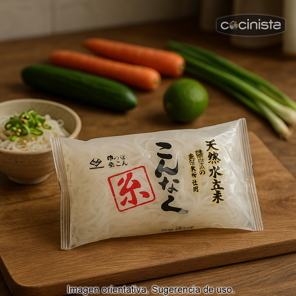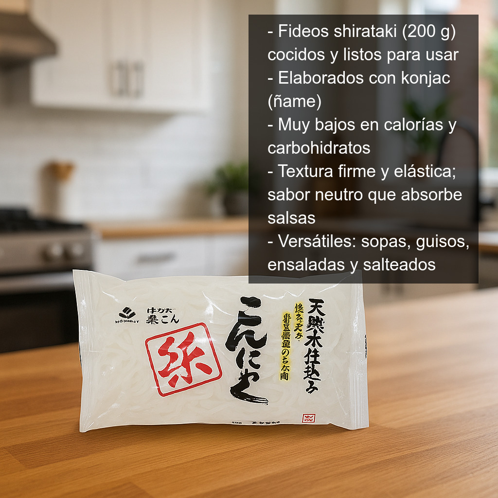 Los fideos shirataki (200 g) son una alternativa ligera a la pasta tradicional, elaborados a partir del ñame konjac (también conocido como konjac o batata asiática). Se presentan cocidos y listos para usar, con un contenido muy bajo en calorías y carbohidratos, lo que los convierte en una opción ideal para quienes buscan recetas más ligeras o siguen una alimentación low carb.