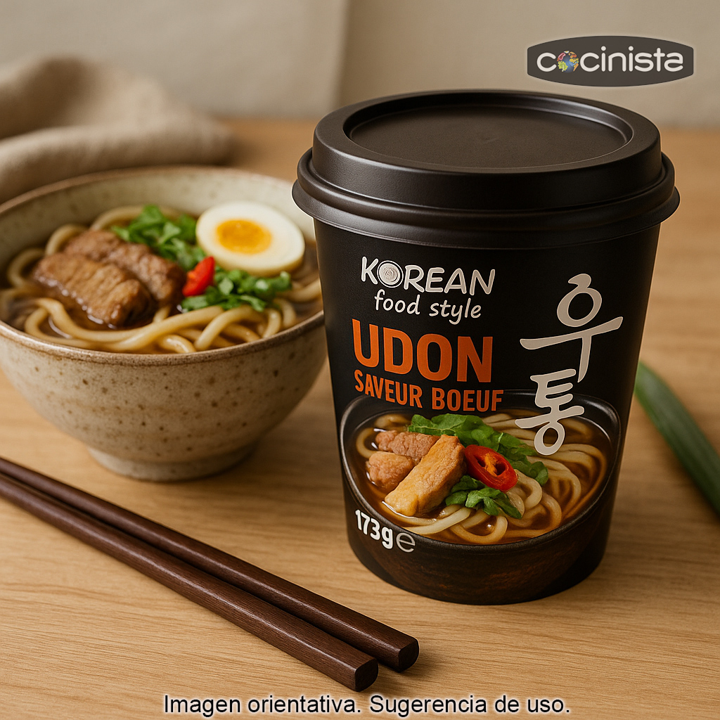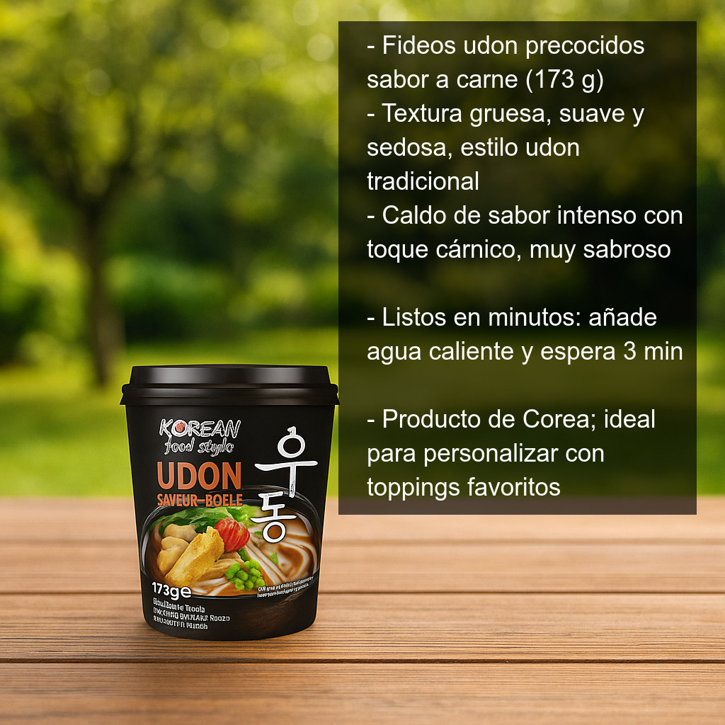Disfruta en casa de un plato reconfortante con estos fideos udon precocidos sabor a carne (173 g), una opción rápida y deliciosa para los amantes de la cocina asiática. Elaborados en Corea, destacan por su textura gruesa, suave y sedosa, característica del udon tradicional, y por su caldo de sabor intenso con un toque cárnico que aporta profundidad y un perfil muy sabroso.