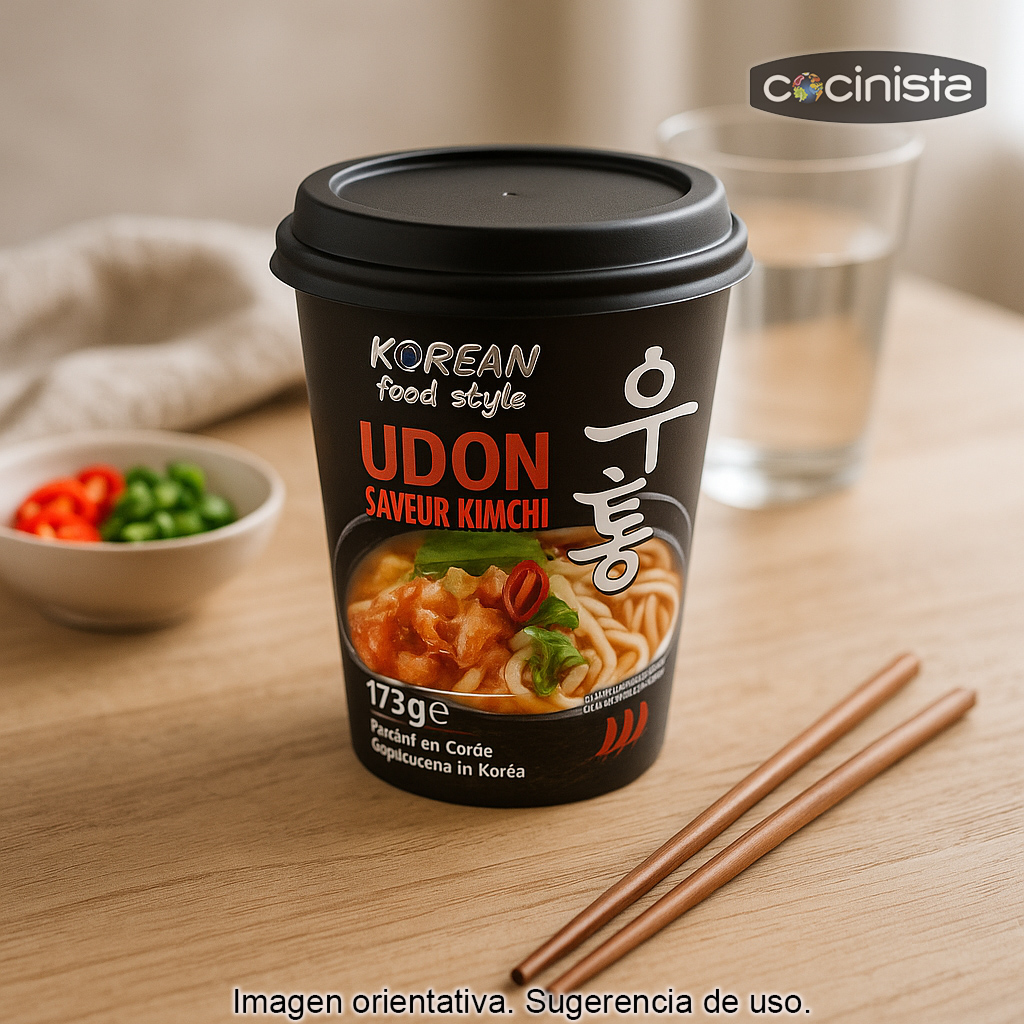 Disfruta en casa de un plato lleno de carácter con estos fideos udon precocidos sabor a kimchi (173 g), un clásico de inspiración coreana pensado para quienes buscan comida asiática rápida sin renunciar a un sabor intenso y auténtico. Elaborados en Corea, combinan la textura inconfundible del udon —grueso, suave y sedoso— con un caldo especiado y profundo que recuerda al kimchi tradicional: notas fermentadas, umami y un picante contundente.