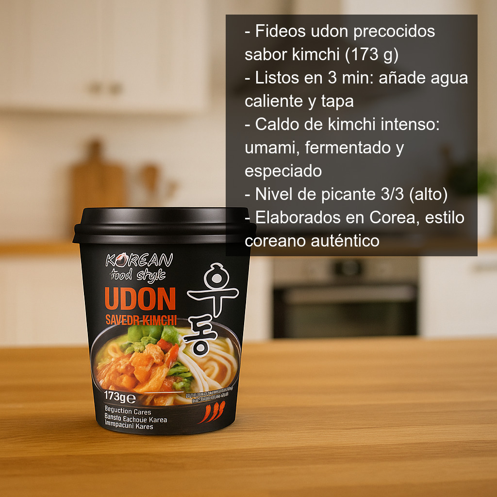 ¿A qué saben? A un caldo de kimchi con personalidad: sabroso, aromático y con un punto picante alto. La base realza el udon y crea un conjunto equilibrado entre textura y potencia de sabor, ideal para amantes del picante y de la cocina coreana.