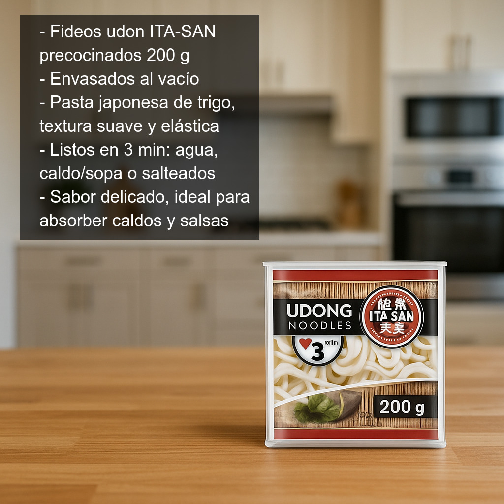 Los fideos udon ITA-SAN son ideales para quienes buscan un resultado auténtico en casa sin complicaciones: al venir precocidos, se calientan rápidamente y mantienen una mordida agradable, sin romperse ni quedar pastosos si se siguen los tiempos recomendados. Este formato de 200 g es perfecto para una ración generosa o para compartir si lo acompañas con más ingredientes (verduras, tofu, setas, pollo, ternera o marisco).