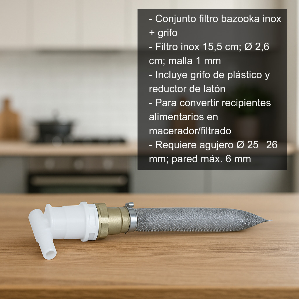 El kit incluye un filtro tipo bazooka (malla metálica) que actúa como colador interno, un grifo de plástico para controlar el caudal y un reductor de latón que permite unir ambos elementos de forma segura. Gracias a este montaje podrás filtrar con mayor comodidad y reducir la cantidad de partículas que pasan al líquido durante el trasvase.