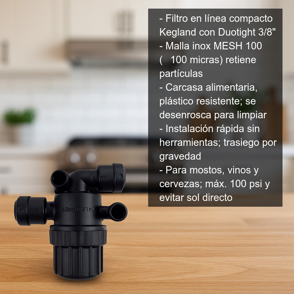 Este filtro en línea es ideal para clarificar líquidos que no estén excesivamente cargados de suciedad, ayudando a retener partículas en suspensión antes de pasar a un depósito, fermentador, barril o recipiente final. El trasiego puede realizarse por simple gravedad, por lo que resulta especialmente práctico en elaboraciones caseras y pequeñas producciones.