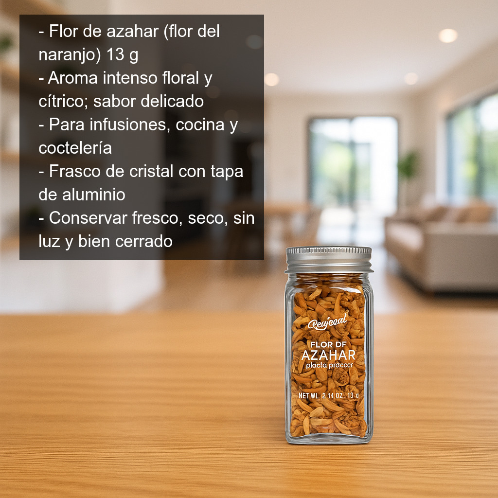 Se sirve en frasco de cristal con tapa de aluminio con 13 g de producto. Para mantener su aroma, conserva la flor de azahar en un lugar fresco, seco y protegido de la luz, manteniendo el envase bien cerrado tras cada uso.