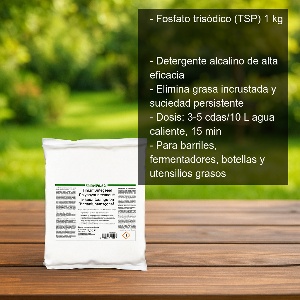 El fosfato trisódico (TSP) es un detergente alcalino de alta eficacia, especialmente indicado para eliminar grasa incrustada, suciedad persistente y manchas en superficies y utensilios. Es un producto muy utilizado en tareas de limpieza intensiva gracias a su gran poder desengrasante, por lo que resulta ideal para quienes necesitan una solución eficaz en entornos de cocina, elaboración y mantenimiento.