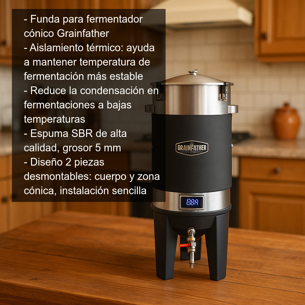 Funda para fermentador cónico Grainfather (funda térmica aislante) diseñada para mejorar el control de la fermentación y proteger tu equipo durante el uso. Esta funda ayuda a mantener una temperatura más estable alrededor del fermentador, reduciendo los cambios bruscos provocados por el ambiente y mejorando el rendimiento de sistemas de refrigeración o cámaras de fermentación.