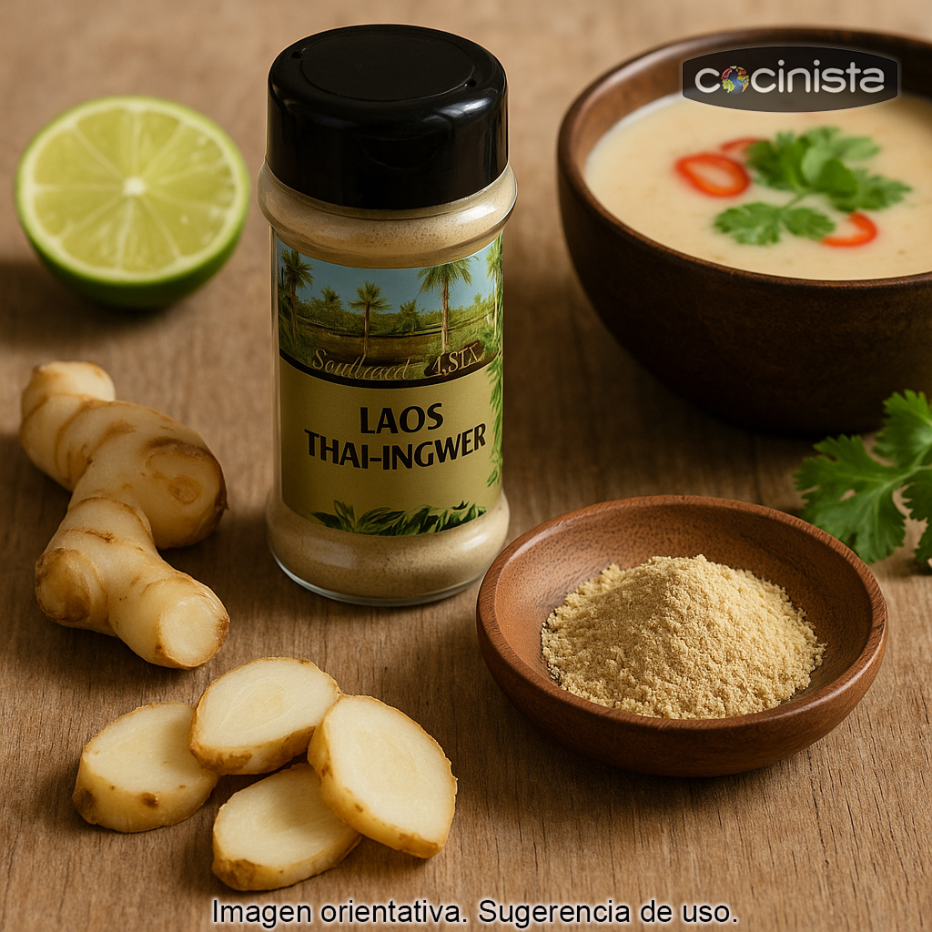 El galangal en polvo se utiliza especialmente en recetas de Tailandia, Indonesia y Malasia, donde aporta frescor y complejidad a caldos, curries, sopas y marinados. Es un ingrediente habitual en preparaciones como la sopa tailandesa Tom Kha Gai, en pastas de curry y en guisos aromáticos donde se busca el equilibrio entre lo ácido, lo picante y lo herbal.