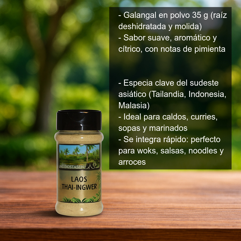 Raíz de galangal (galanga) deshidratada y molida. Conocido a menudo como “jengibre tailandés”, el galangal pertenece a la misma familia que el jengibre, pero ofrece un perfil más suave, aromático y cítrico, con notas de pimienta y un fondo ligeramente terroso. Es una especia imprescindible en la cocina del sudeste asiático y una forma fácil de dar un toque auténtico a tus platos.
