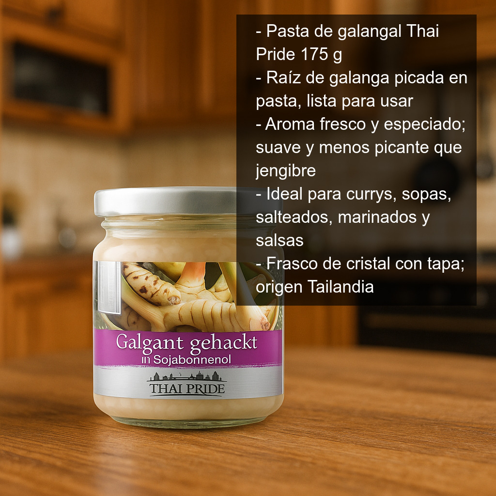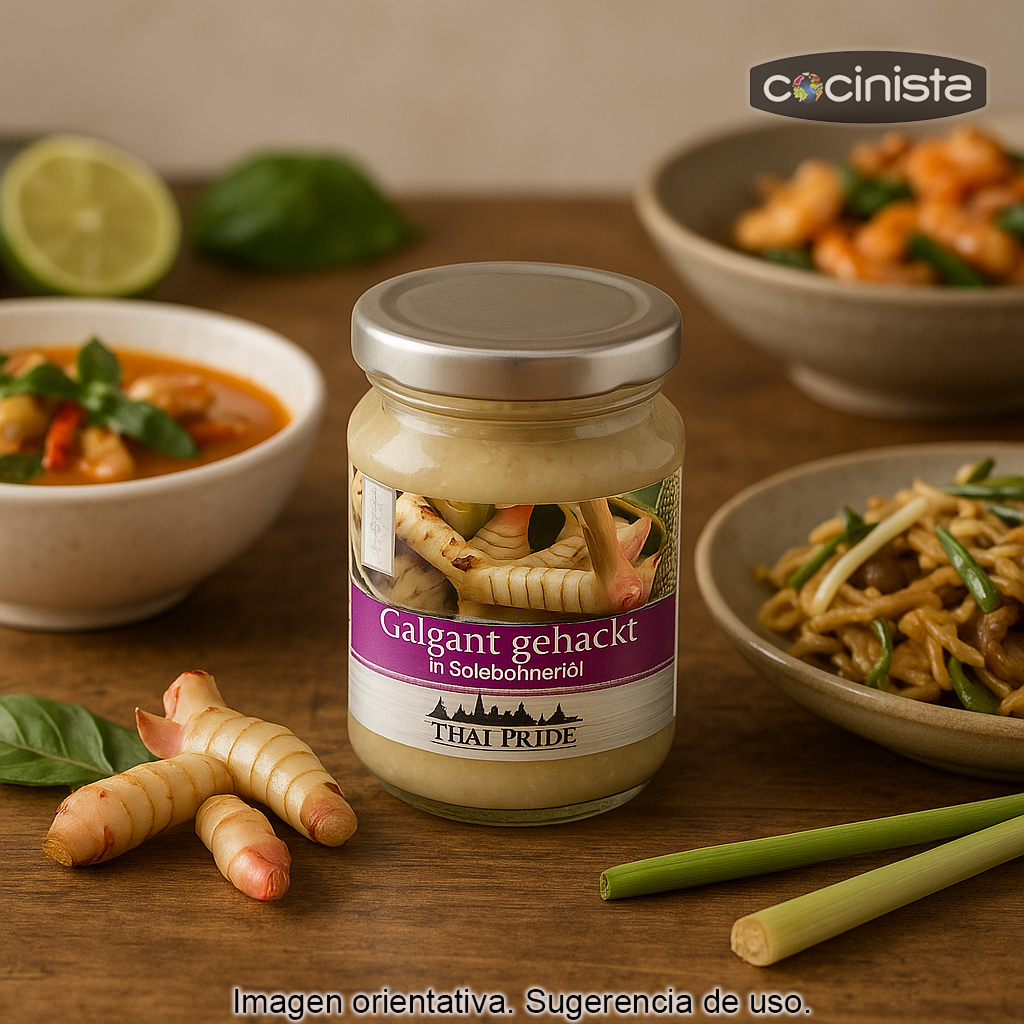 Raíz de galangal (galanga) picada en pasta, lista para usar y perfecta para tener siempre a mano en la nevera. Este ingrediente imprescindible de la cocina tailandesa y del Sudeste Asiático aporta un aroma fresco y especiado que transforma al instante sopas, currys, salteados y marinados.