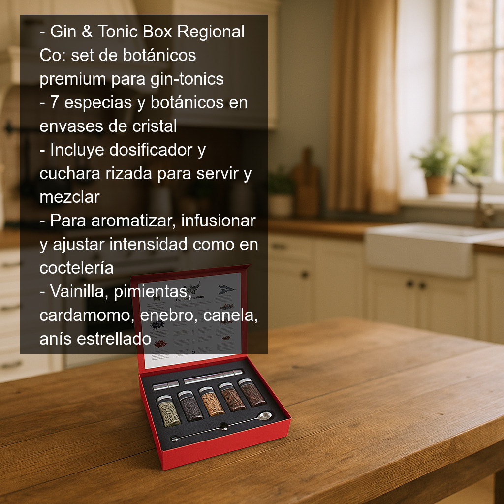 La Gin & Tonic Box de Regional Co es un set de botánicos premium pensado para que puedas aromatizar y personalizar tus gin-tonics como en una coctelería. Incluye 7 especias y botánicos esenciales en envases de cristal, ideales para experimentar con diferentes ginebras y tónicas, ajustar la intensidad del aroma y conseguir combinaciones equilibradas.