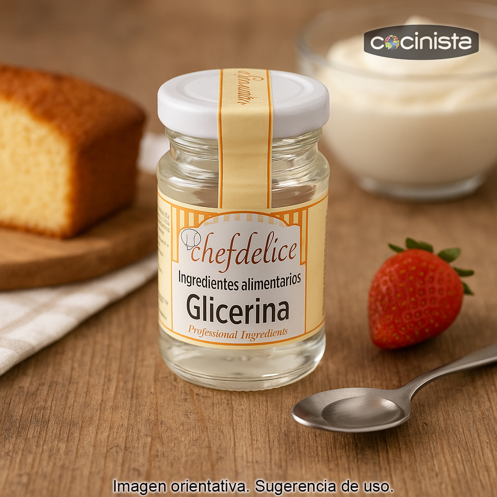 La glicerina es un líquido incoloro, de sabor ligeramente dulce y soluble en agua. En elaboraciones culinarias se emplea como humectante (ayuda a que masas y cremas no se resequen), como estabilizante (mejora la consistencia) y como conservante (contribuye a mantener la frescura). Además, al tratarse de un tipo de azúcar alcohol, puede aportar un toque de dulzor sin cristalizar como el azúcar común.