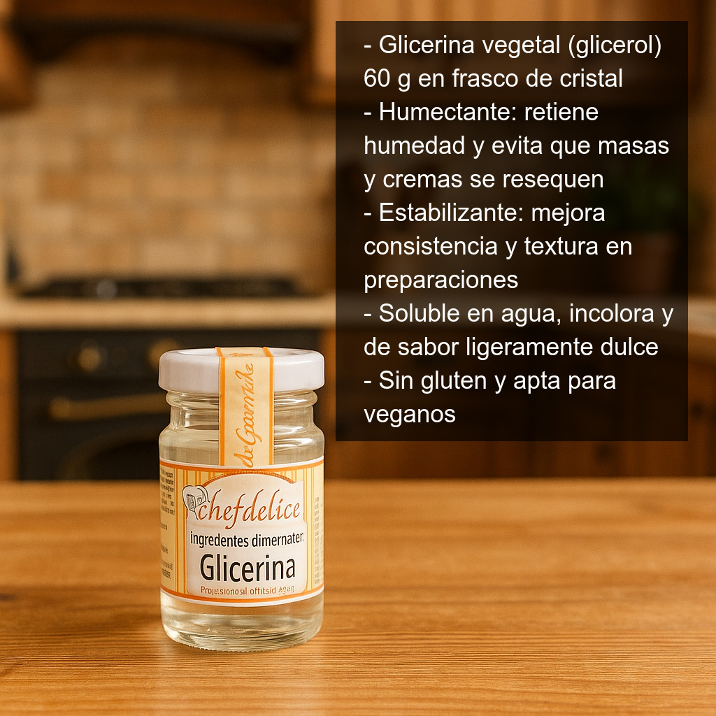 La glicerina vegetal (también conocida como glicerol) es un ingrediente versátil muy utilizado en cocina y repostería por su capacidad para retener humedad, mejorar texturas y estabilizar preparaciones. Esta presentación viene en frasco de cristal con 60 g de producto, ideal para tener siempre a mano en tu despensa de ingredientes de pastelería.