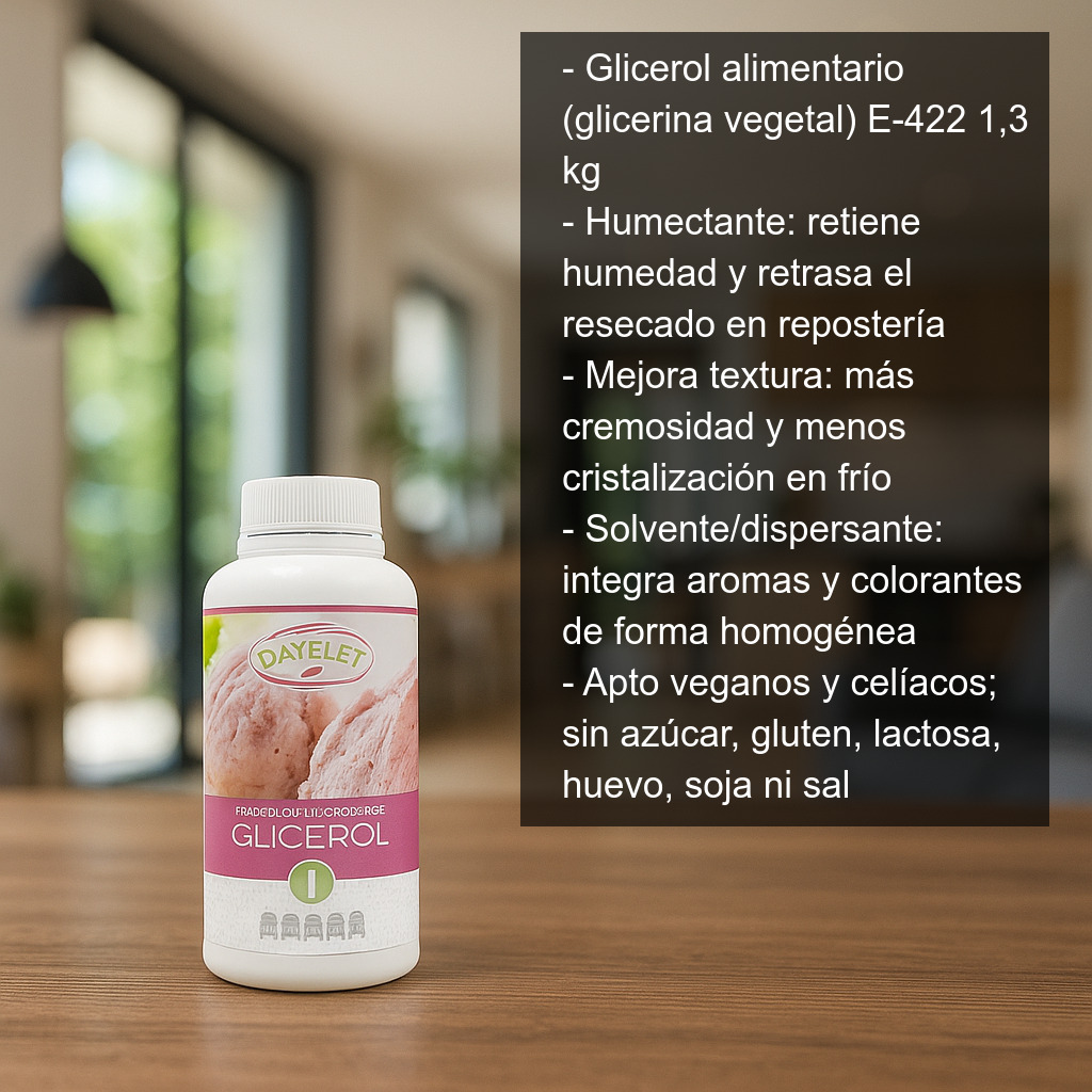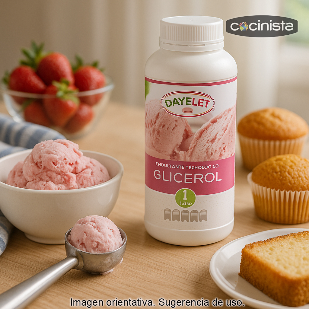 El glicerol alimentario (también conocido como glicerina vegetal, aditivo E-422) es un ingrediente muy versátil en pastelería, heladería y cocina creativa. Se utiliza principalmente por su capacidad para retener humedad, aportar una dulzura suave y mejorar la textura de numerosas elaboraciones, ayudando a conseguir resultados más estables y agradables al paladar.