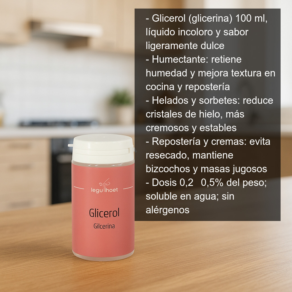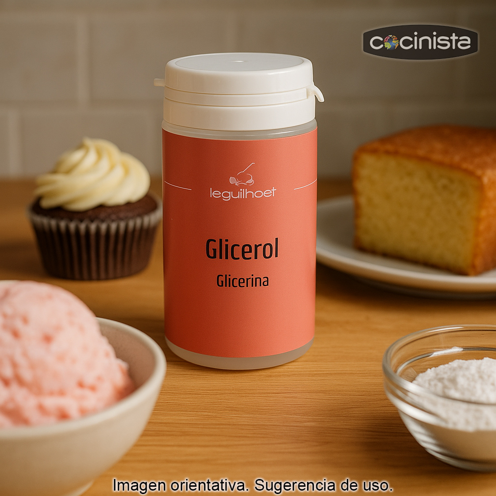 La glicerol (también conocida como glicerina) es un compuesto líquido, incoloro y de sabor ligeramente dulce, muy utilizado en cocina y repostería por su capacidad para retener la humedad y mejorar la textura de numerosas elaboraciones. Es soluble en agua y se emplea habitualmente como humectante, estabilizante y conservante, además de aportar un suave efecto edulcorante al tratarse de un tipo de azúcar (poliol).