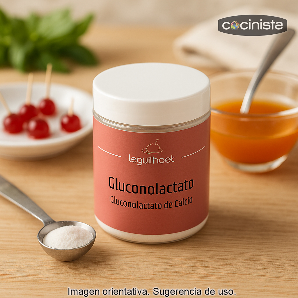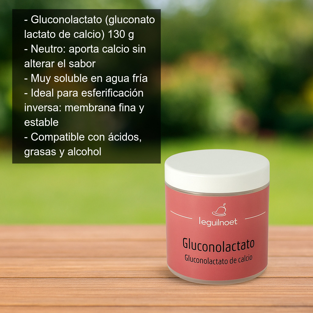 El gluconolactato (también conocido como gluconato lactato de calcio) es un ingrediente imprescindible en cocina molecular para aportar calcio a preparaciones líquidas sin alterar su sabor. Se utiliza especialmente en la técnica de esferificación inversa, ya que permite que el alimento contenga el calcio necesario para reaccionar con el alginato del baño y formar una membrana fina y estable.