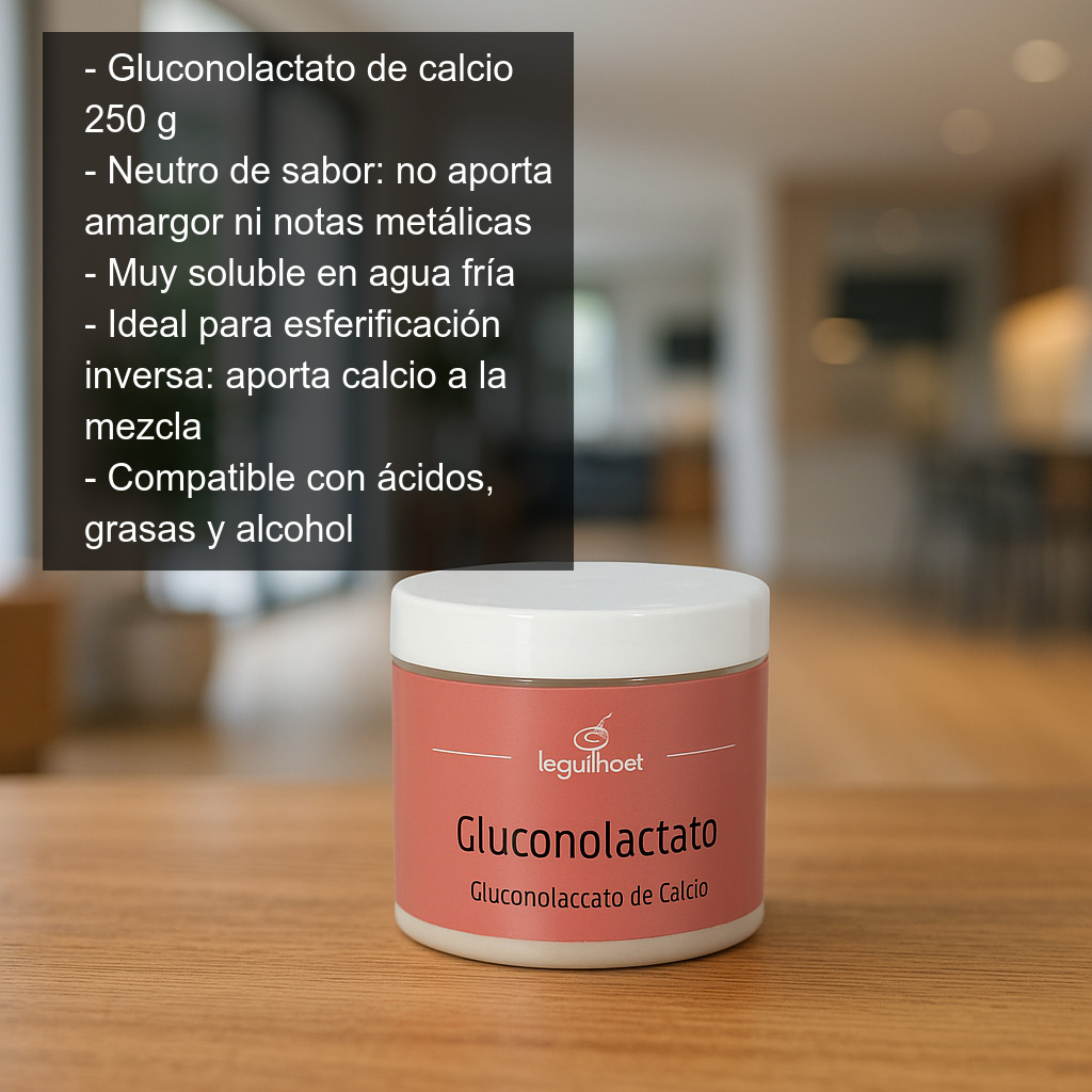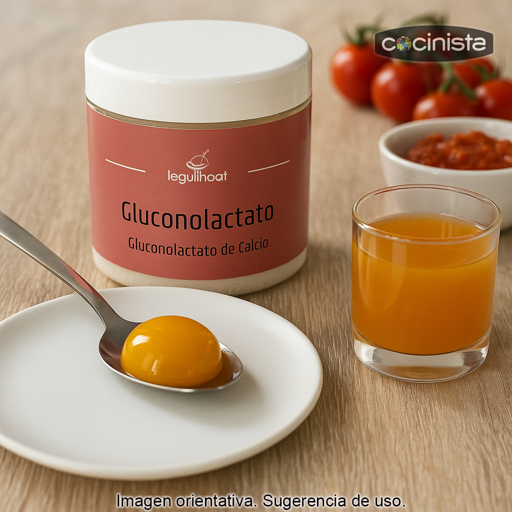 El gluconolactato de calcio (también conocido como calcium gluconolactate) es un ingrediente imprescindible en cocina molecular para aportar calcio a preparaciones líquidas o semilíquidas sin alterar su sabor. Se utiliza especialmente en la esferificación inversa, ya que permite que el alimento contenga el calcio necesario para reaccionar con el alginato del baño y formar una membrana fina y estable.