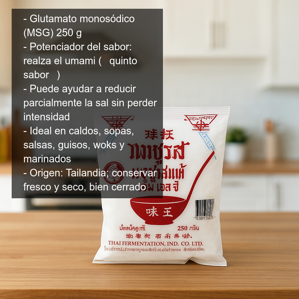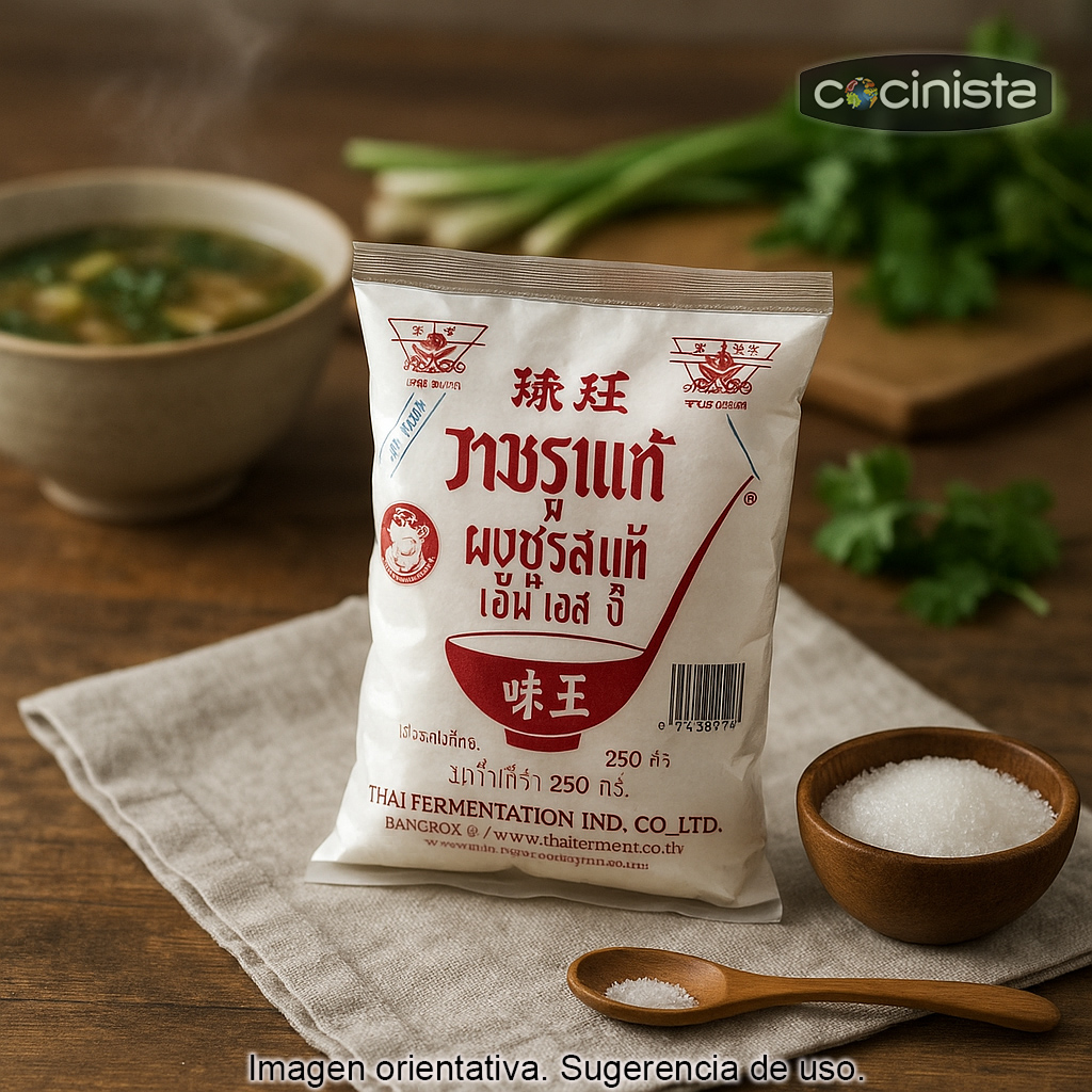 El glutamato monosódico (también conocido como MSG por sus siglas en inglés) es un potenciador del sabor muy utilizado en la cocina asiática —especialmente en China, Japón, Corea y Tailandia— y también en la industria alimentaria a nivel mundial. Su función principal es realzar el sabor natural de los ingredientes, aportando el característico umami, el llamado “quinto sabor”, asociado a preparaciones sabrosas, redondas y con más profundidad.