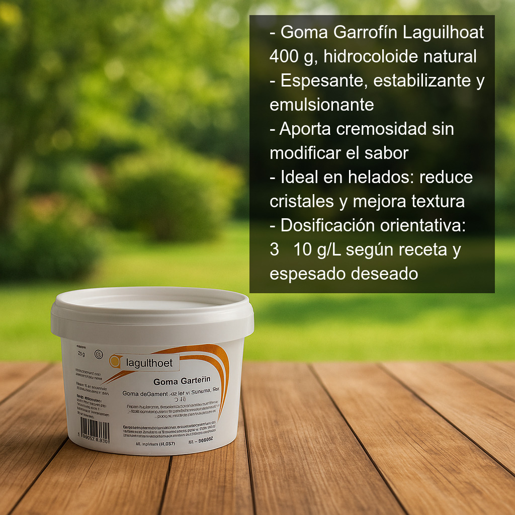 La goma de garrofín, también conocida como goma de algarrobo o harina de semilla de algarroba, es un hidrocoloide natural muy utilizado en cocina y pastelería profesional como espesante, estabilizante y emulsionante. Es especialmente apreciada por su capacidad para mejorar la textura y aportar cremosidad sin modificar el sabor, ayudando a obtener elaboraciones más estables y homogéneas.