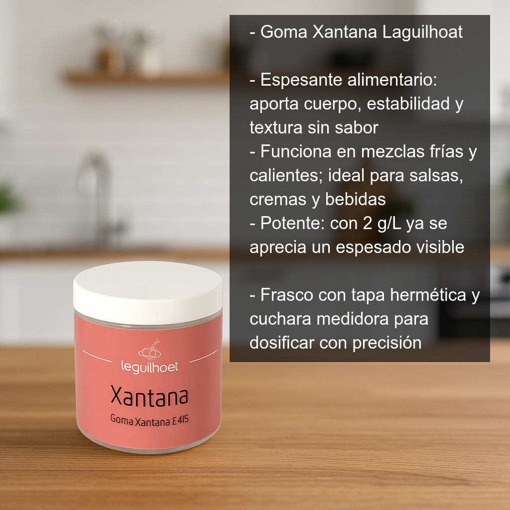 La goma xantana es incolora e insípida, y destaca por su gran potencia: con solo 2 g por litro ya se aprecia un espesado visible. Además, contribuye a estabilizar mezclas y a reducir la separación de fases en elaboraciones donde conviven agua y grasa.