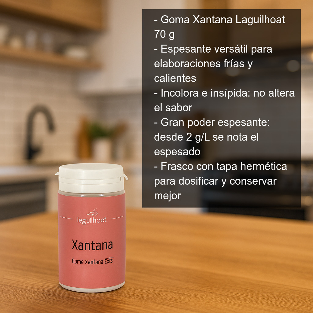 La Goma Xantana Laguilhoat se presenta en frasco con tapa hermética con 70 g de producto, ideal para dosificar con precisión y conservar el ingrediente en perfectas condiciones.
