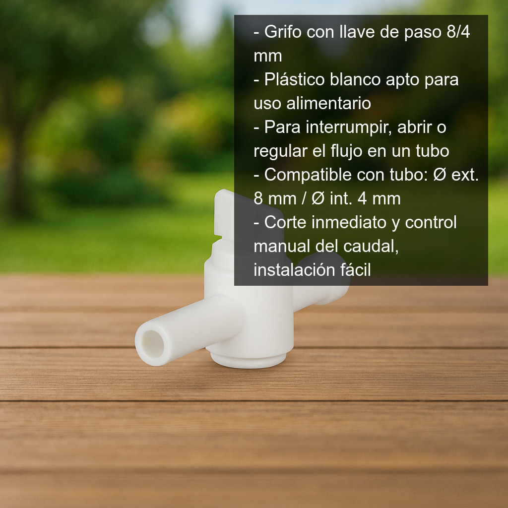 Grifo con llave de paso 8 / 4 mm fabricado en material plástico blanco de calidad alimentaria, diseñado para interrumpir, abrir o regular el flujo de líquido en un tubo de forma rápida y segura. Es un accesorio práctico para instalaciones donde se necesite controlar el paso de agua u otros líquidos compatibles, evitando goteos y facilitando el mantenimiento del circuito.
