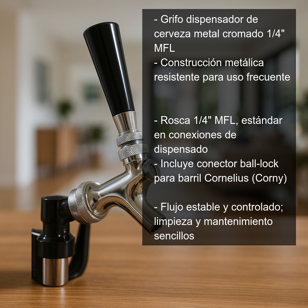 Grifo dispensador de cerveza de metal cromado con rosca de 1/4" MFL. Muy resistente e ideal para tirar la cerveza perfecta.