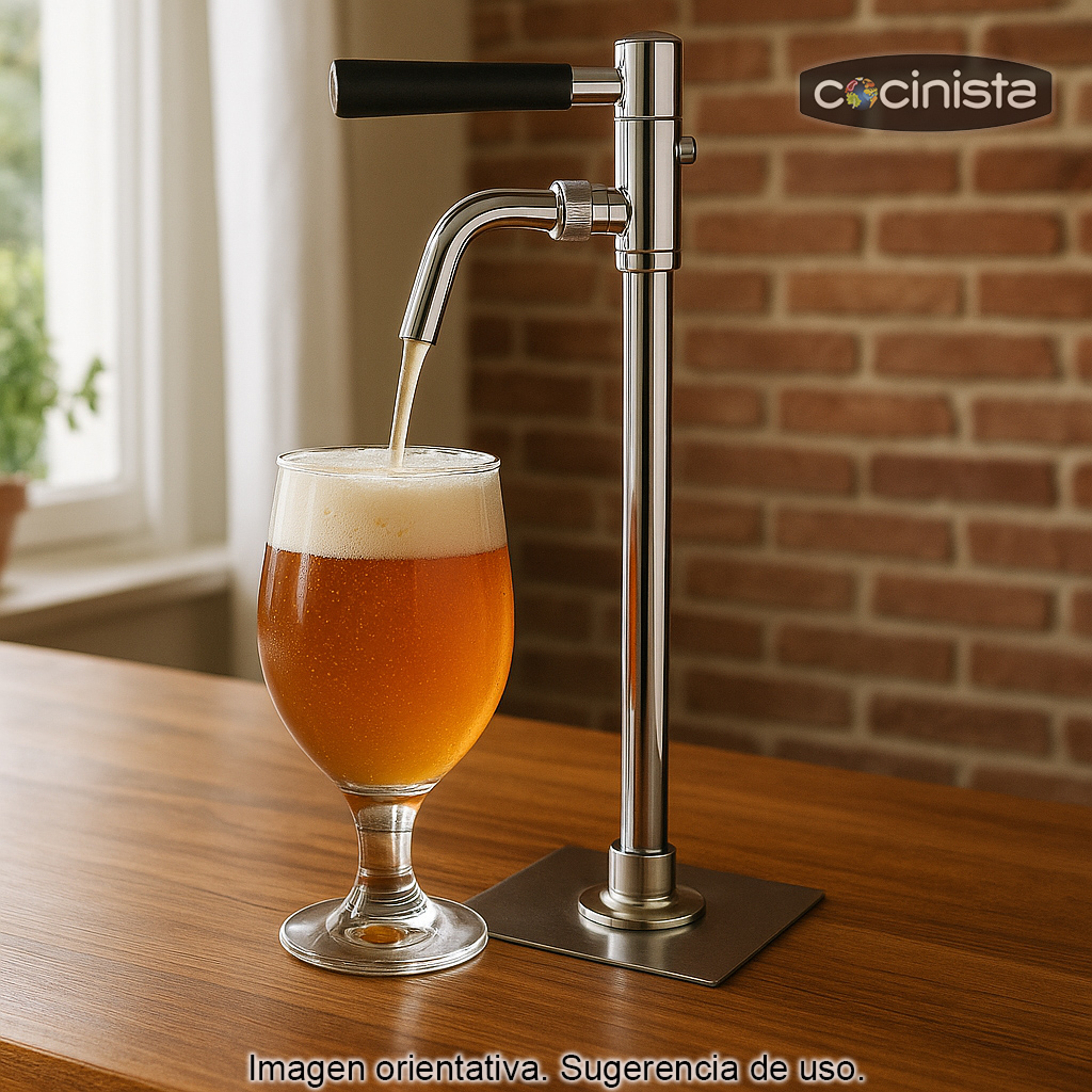 El grifo cuenta con acción lateral, un sistema cómodo para abrir y cerrar el paso de la bebida con un gesto rápido, facilitando el servicio continuo y el control del caudal.