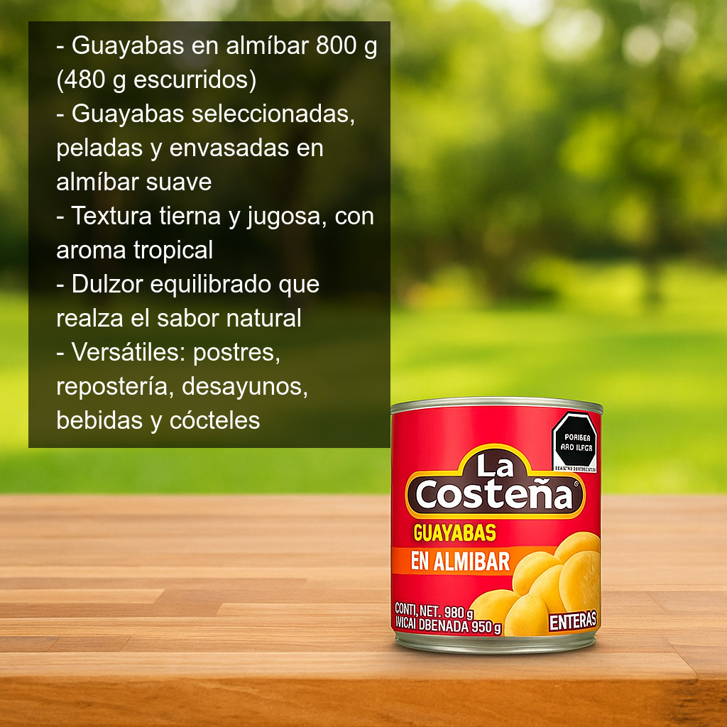 Las guayabas en almíbar son una conserva tradicional elaborada con guayabas cuidadosamente seleccionadas, peladas y envasadas en un almíbar suave y equilibrado que realza su dulzor natural sin enmascarar su sabor. Gracias a su textura tierna y jugosa y a su inconfundible aroma tropical, son un clásico muy apreciado en la gastronomía mexicana y latinoamericana, perfecto para tener siempre a mano en la despensa.