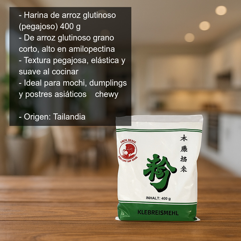Se presenta en bolsa de 400 g de harina de arroz glutinoso.