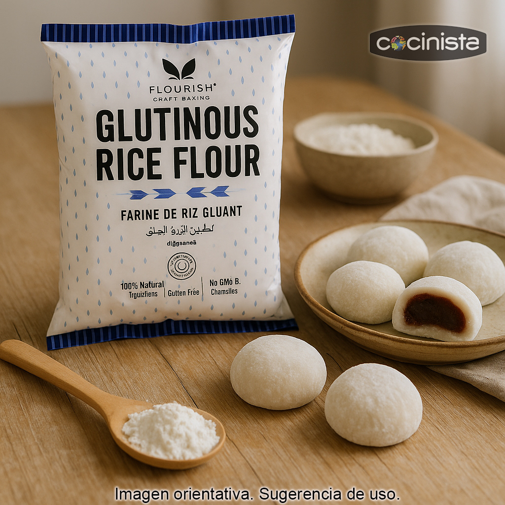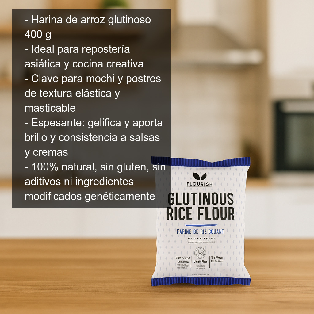 Harina de arroz glutinoso en bolsa de 400 g, ideal para quienes buscan una harina fina y versátil para repostería asiática y cocina creativa. También conocida como harina de arroz pegajoso (glutinous rice flour), es el ingrediente clave para conseguir texturas elásticas, suaves y ligeramente masticables en muchas elaboraciones tradicionales.