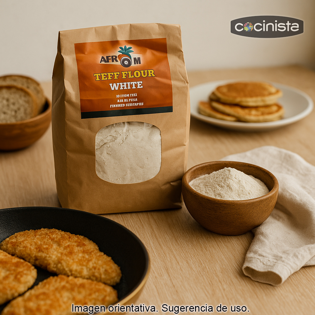 Gracias a su textura fina, la harina de teff blanca es ideal para rebozados crujientes, para aportar un toque diferente a masas y para enriquecer preparaciones de panadería y repostería. Es una harina muy interesante para dietas sin gluten y para quienes desean aumentar el aporte de fibra en su alimentación diaria.