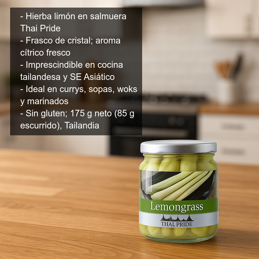 Hierba limón (también conocida como lemongrass) en frasco de cristal, conservada en salmuera para mantener su aroma fresco y cítrico durante más tiempo. Es un ingrediente imprescindible en la cocina tailandesa y del Sudeste Asiático, perfecto para tener siempre en la nevera y preparar en casa recetas con auténtico sabor.