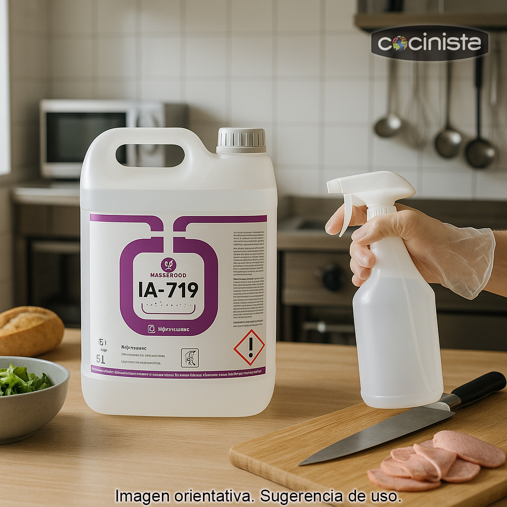 Su uso es muy sencillo: basta con rociar sobre la superficie previamente limpia que se desea higienizar. Gracias a su alto contenido alcohólico, no requiere aclarado (en condiciones de uso habituales), lo que lo convierte en un aliado ideal para la higienización frecuente de zonas de trabajo y utensilios entre tareas.