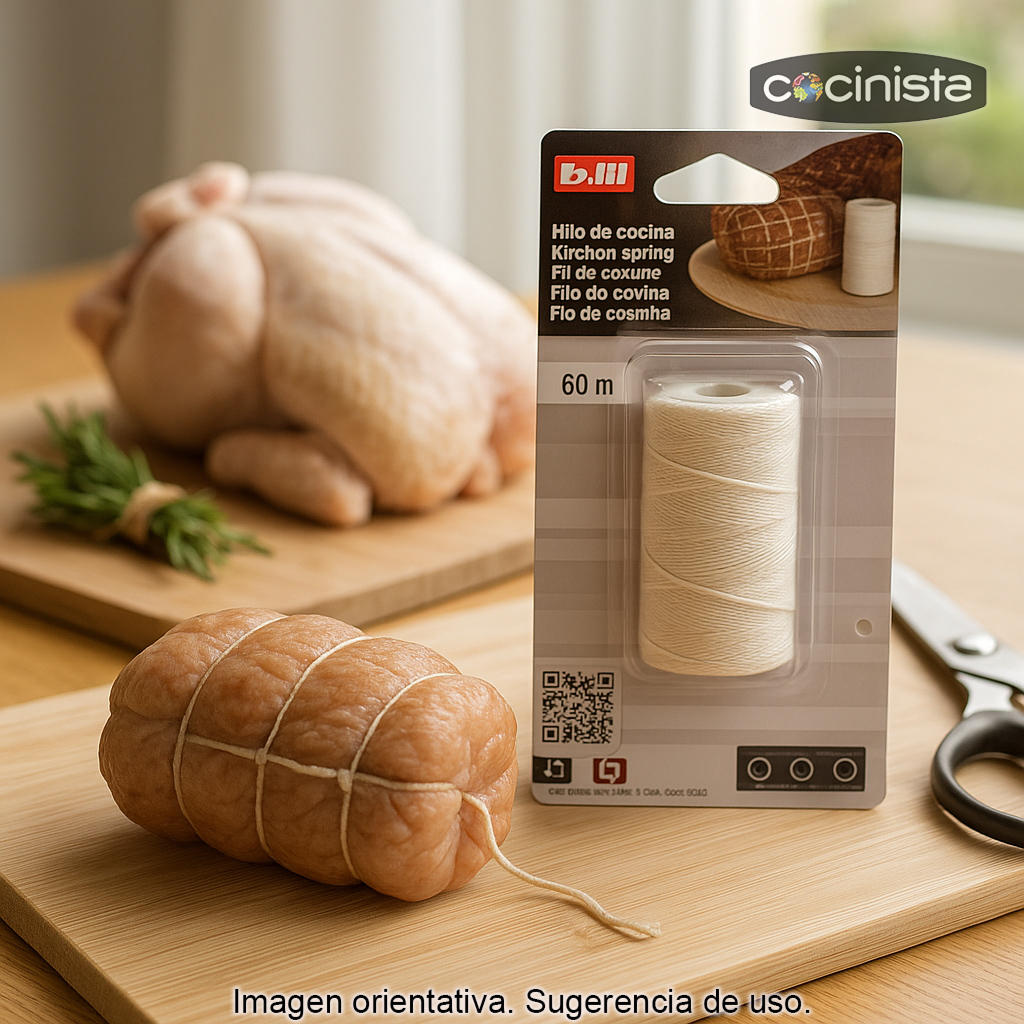 Consejo de uso: corta la longitud necesaria, realiza un nudo firme (doble nudo si la pieza es pesada) y recorta el sobrante. Para asados, deja el hilo bien tensado pero sin estrangular la pieza para no marcar en exceso la superficie.