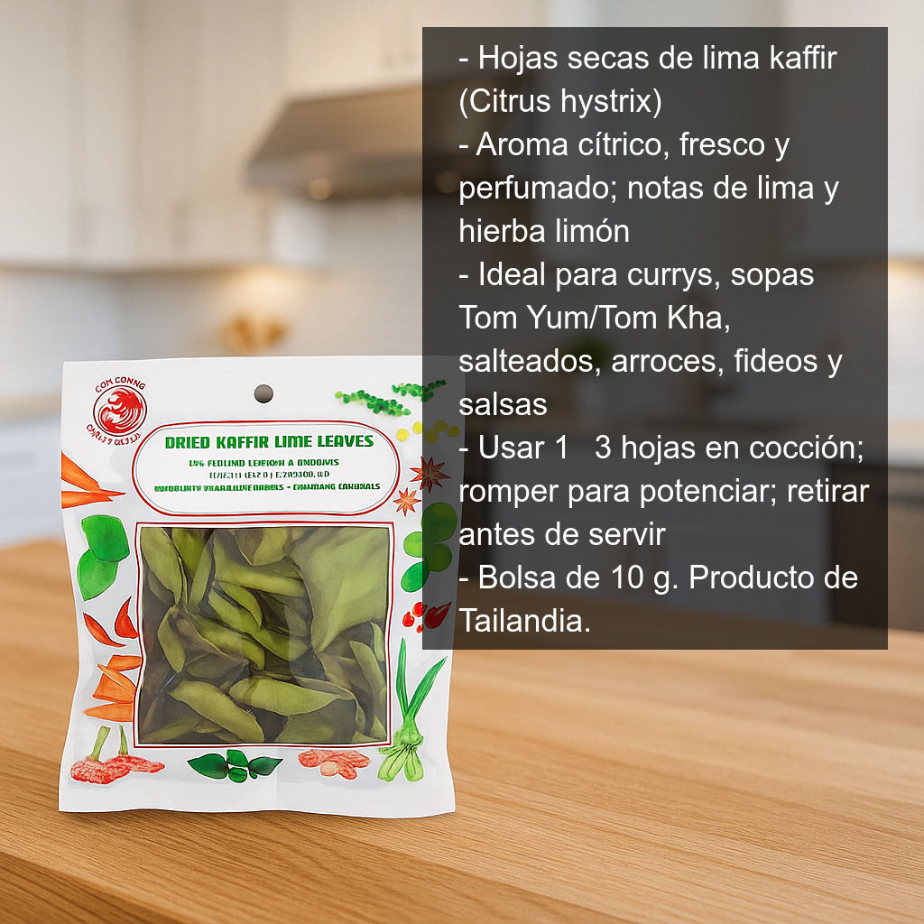Hojas secas de lima kaffir (Citrus hystrix), un ingrediente imprescindible de la cocina tailandesa y del Sudeste Asiático. Su aroma es intensamente cítrico, fresco y perfumado, con notas que recuerdan a la lima y a la hierba limón, perfecto para aportar profundidad y un toque exótico a tus recetas.
