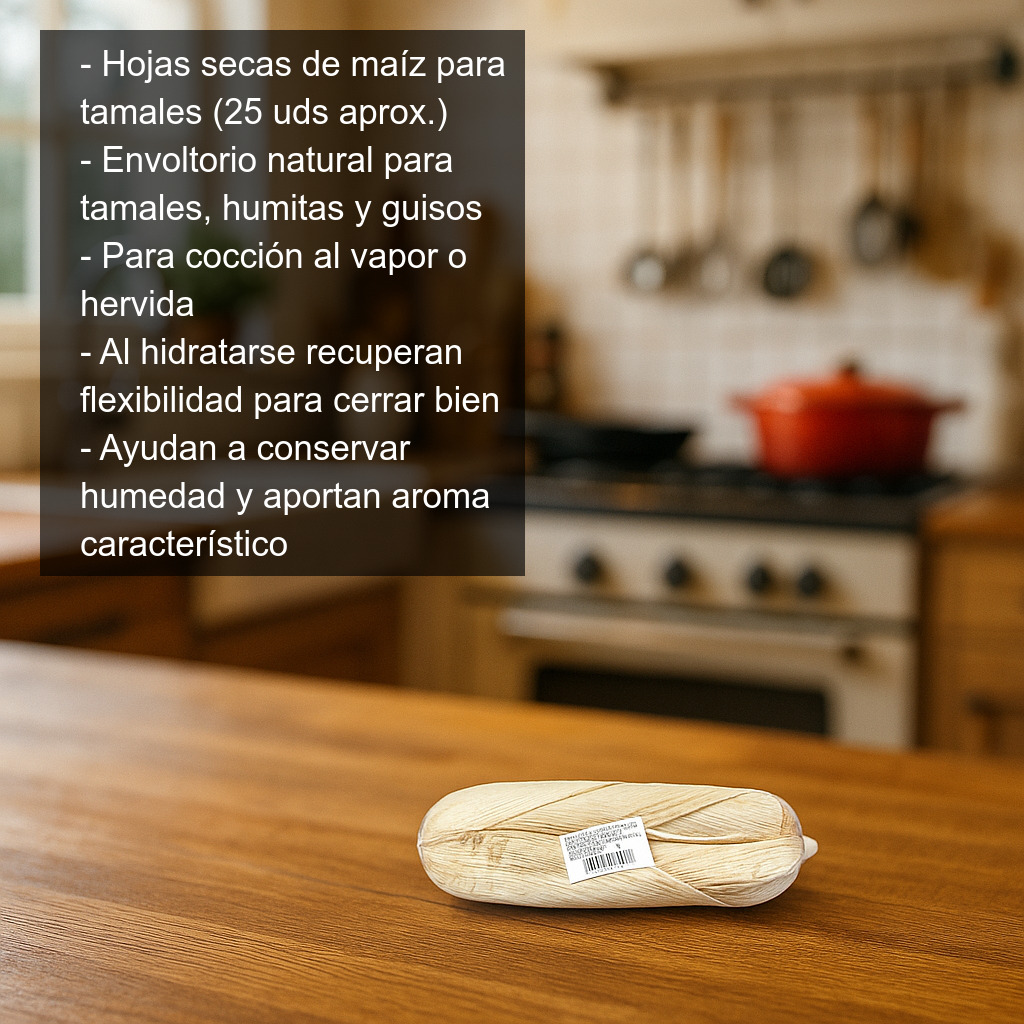Hojas secas de maíz (25 uds aprox.) ideales para preparar tamales (salados o dulces), humitas y otras recetas tradicionales de la cocina latinoamericana. Estas hojas de maíz para tamales se utilizan como envoltorio natural para masas y guisos, ayudando a mantener la forma durante la cocción y aportando un aroma característico al cocinarse al vapor o hervidas.