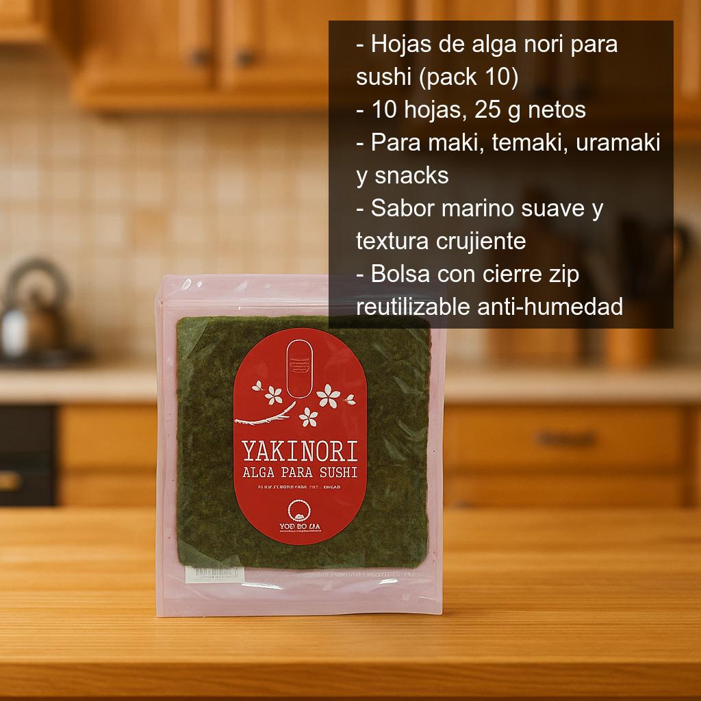 Hojas de alga nori para sushi (pack de 10 unidades), ideales para preparar maki, temaki, uramaki y otras recetas de cocina japonesa en casa. Este pack incluye 10 hojas de nori con un peso total de 25 g, perfectas para envolver arroz de sushi y rellenos como salmón, atún, aguacate, pepino o surimi.