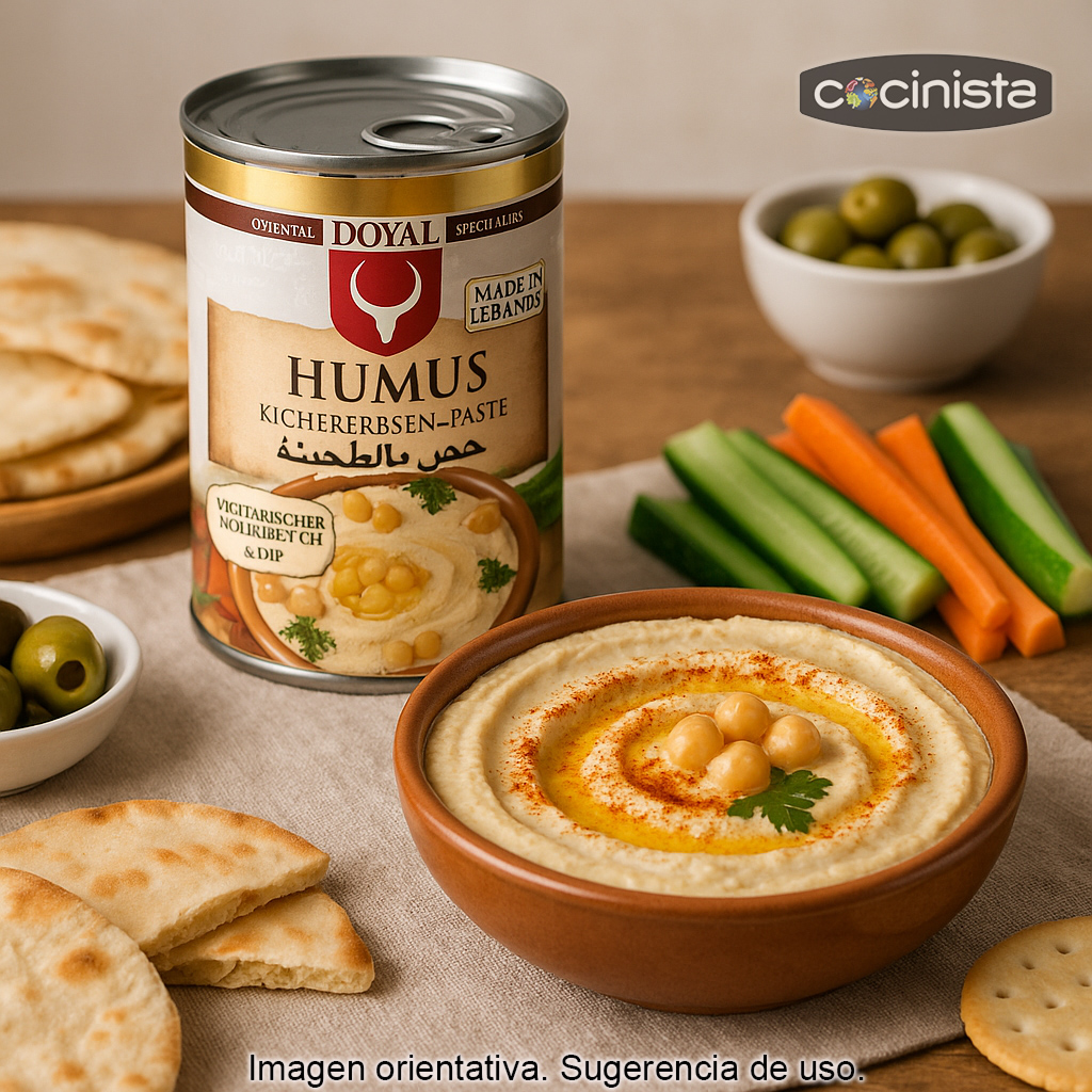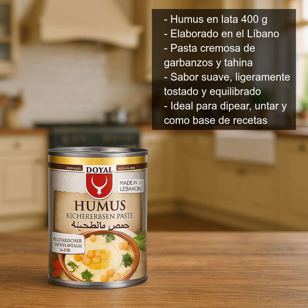 El humus (o hummus) en lata de 400 g es una cremosa pasta tradicional de Oriente Medio elaborada principalmente con garbanzos y tahina (pasta de sésamo), que aporta un sabor suave, ligeramente tostado y muy equilibrado. Este hummus libanés es una opción práctica para tener siempre a mano un aperitivo rápido, un dip para compartir o una base versátil para recetas.