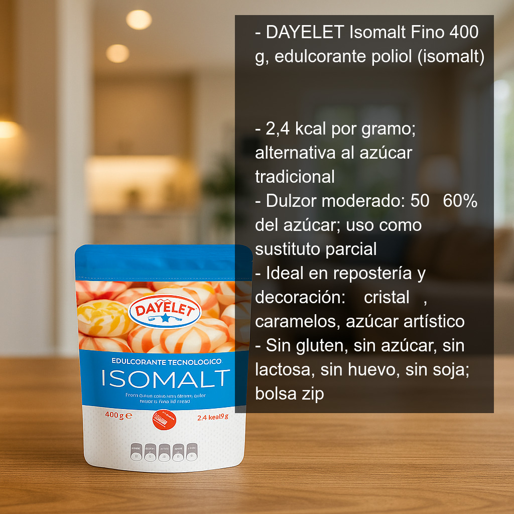 DAYELET Isomalt Fino es un edulcorante de la familia de los polioles (isomalt), obtenido mediante hidrogenación catalítica de una solución de sacarosa. En otras palabras, se trata de un derivado del azúcar modificado para ofrecer un dulzor más suave y un comportamiento muy estable en elaboraciones de repostería y pastelería.