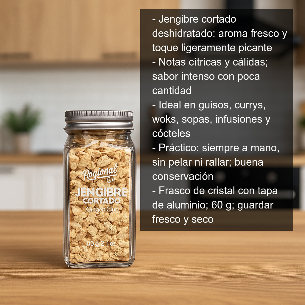 El jengibre cortado deshidratado es un ingrediente importante en la despensa si buscas aportar un aroma fresco y un punto ligeramente picante a tus recetas. Este jengibre en trozos pequeños concentra el sabor característico de la raíz, con notas cítricas y cálidas, perfecto para dar un toque asiático a guisos, salteados y sopas, o un matiz exótico a infusiones y cócteles.