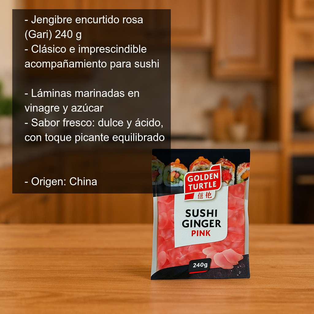 El jengibre encurtido rosa, conocido en Japón como Gari, es el acompañamiento clásico e imprescindible en cualquier experiencia de sushi. Sus finas láminas de jengibre marinadas en una mezcla suave de vinagre y azúcar aportan un sabor fresco, ligeramente dulce y ácido, con un toque picante muy equilibrado.