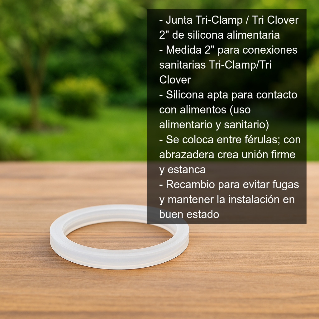 La junta para Tri-Clamp / Tri Clover de 2" es un recambio imprescindible para garantizar un sellado estanco en conexiones sanitarias tipo Tri-Clamp. Fabricada en silicona de calidad alimentaria, está pensada para aplicaciones donde la higiene y la seguridad del producto son prioritarias.