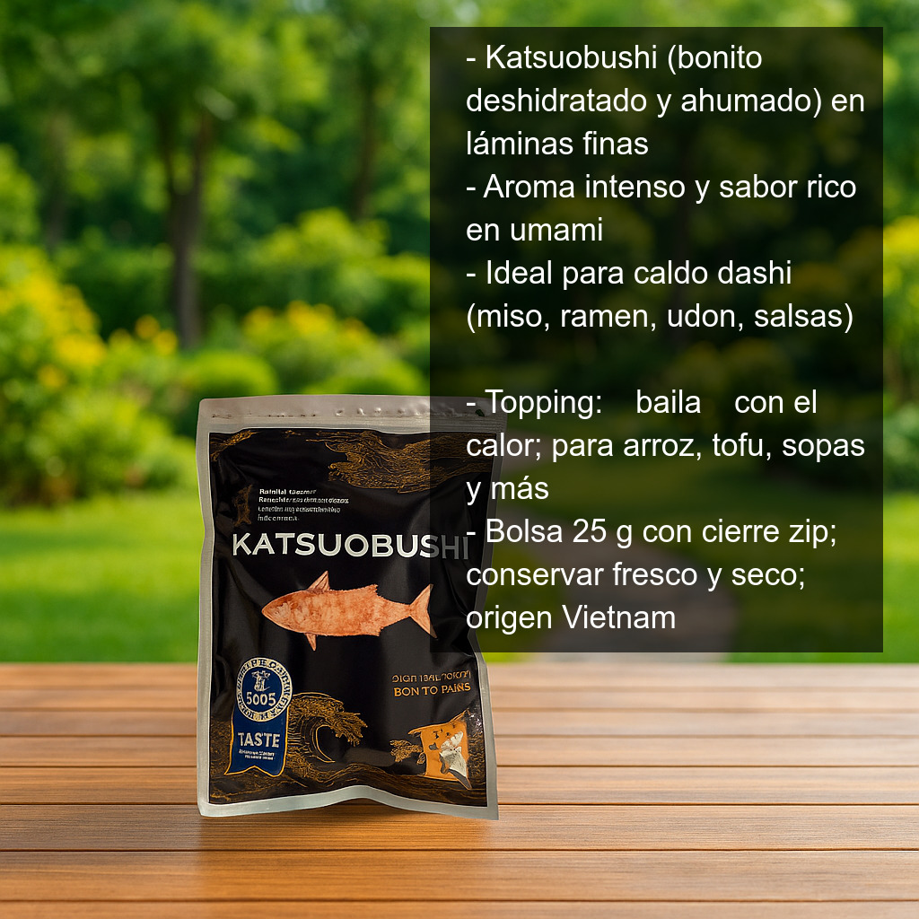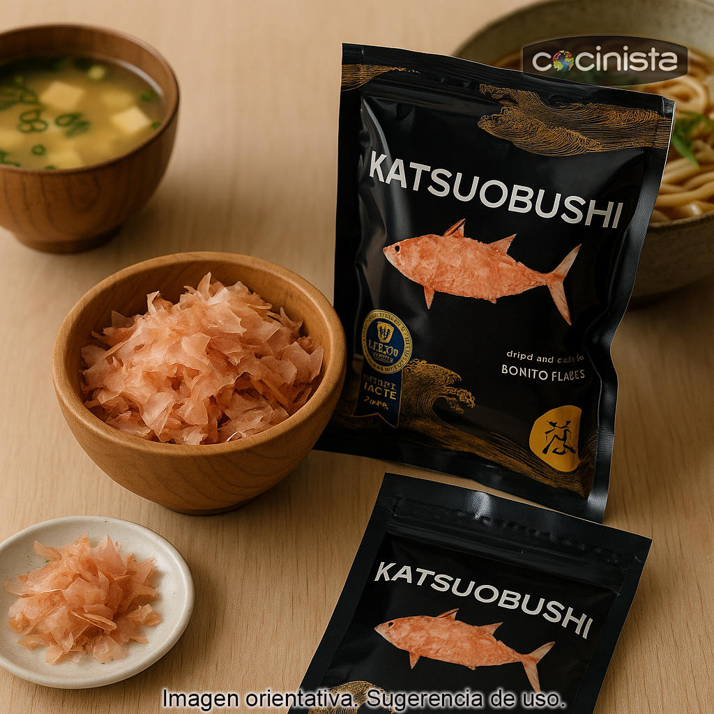 En Japón, el katsuobushi es la base del caldo dashi, imprescindible para recetas como sopa de miso, ramen, udon o salsas y aderezos. También se utiliza como topping: al contacto con el calor, las láminas “bailan” sobre la comida, aportando un acabado visual y un sabor inconfundible.